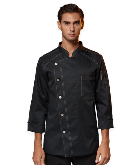 أضف لمسةً من الأناقة والمتانة إلى ملابس مطبخك مع معطف الطاهي الأسود المصنوع من الدنيم. صُمم هذا المعطف للطهاة المحترفين، ويتميز بياقة ماندرين عصرية، وجيب عملي على الصدر، وجيب عملي على الأكمام لمزيد من الراحة. تضفي الخياطة المتباينة لمسةً أنيقةً ومصممةً بعناية، بينما يوفر قماش الدنيم عالي الجودة الراحة والمتانة.