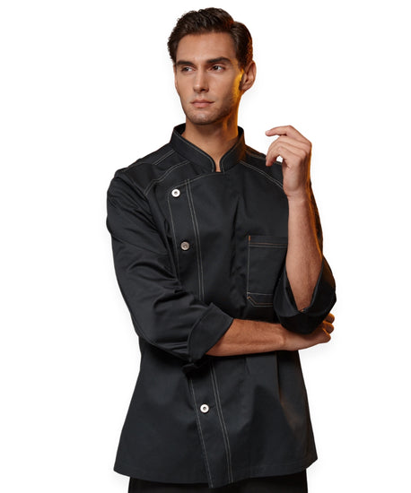 معطف طاهٍ أسود من قماش الدنيم - ياقة ماندرين، جيب على الأكمام، وخياطة متباينة